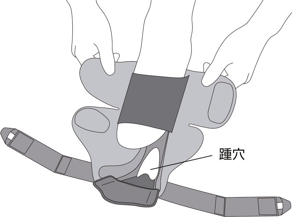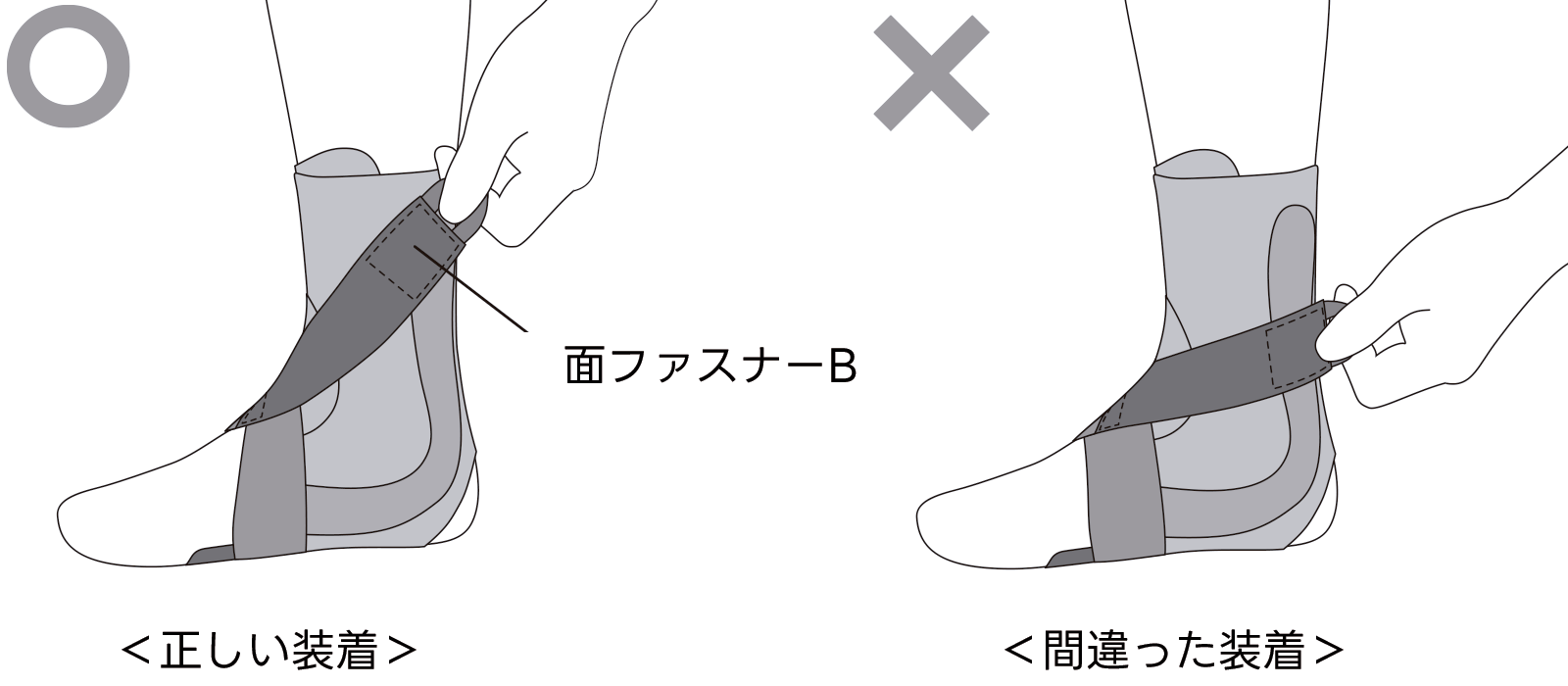 下側の面ファスナーは足先の方向に、上側の面ファスナーは上方向に、それぞれ引っ張りながら貼り合わせてください。