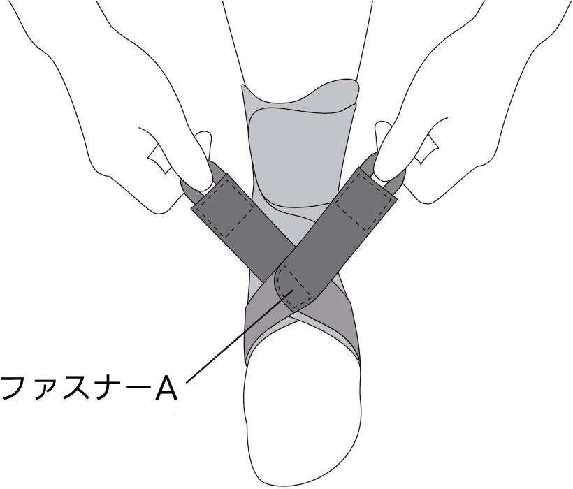 クロスバンドの面ファスナーAを足の甲で貼り合わせます。
