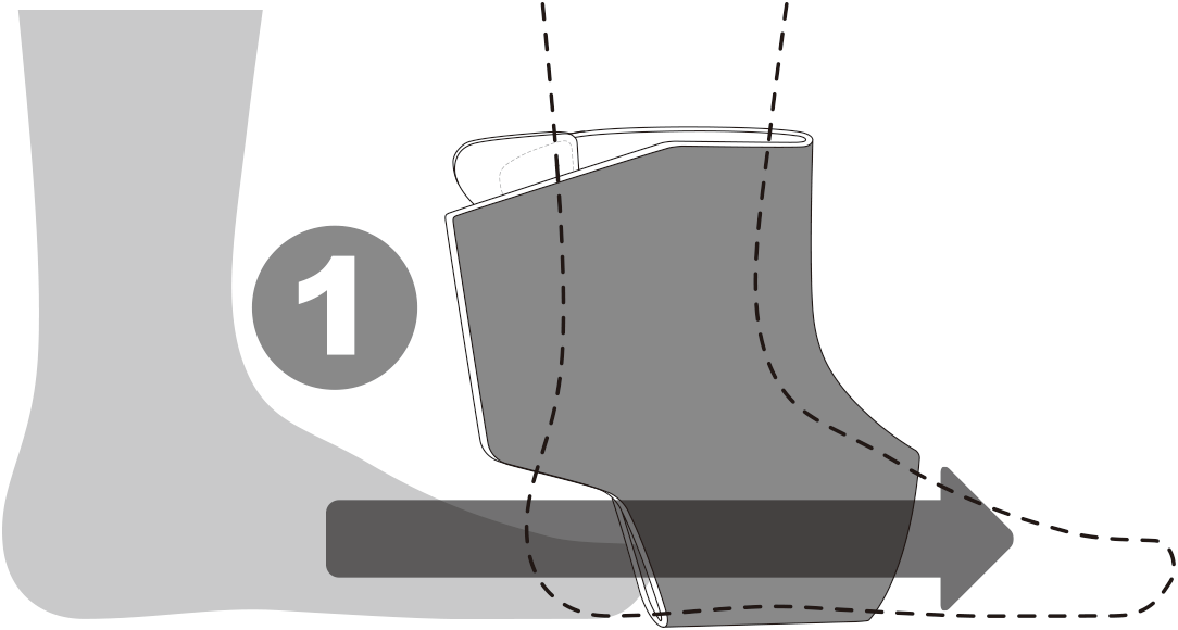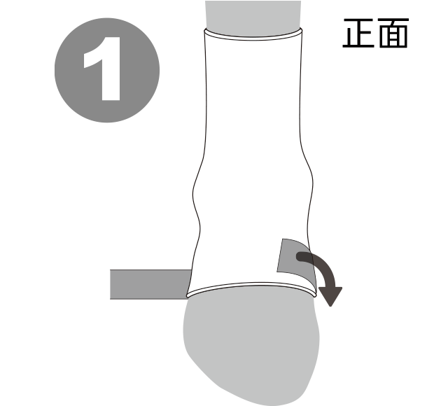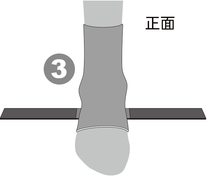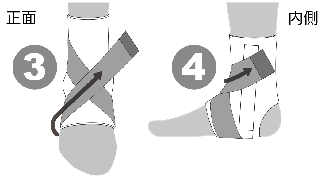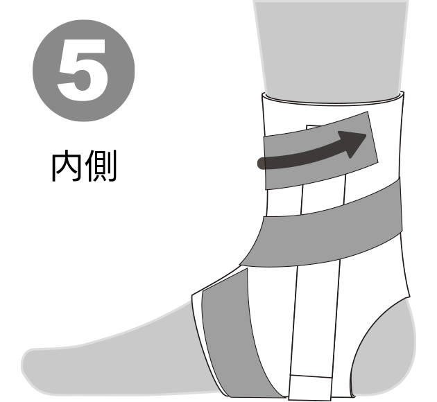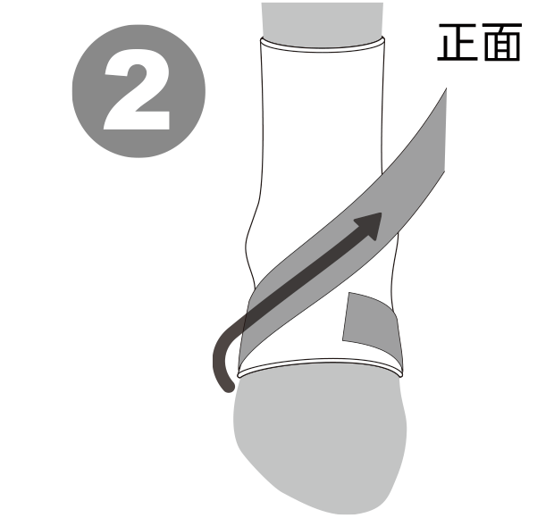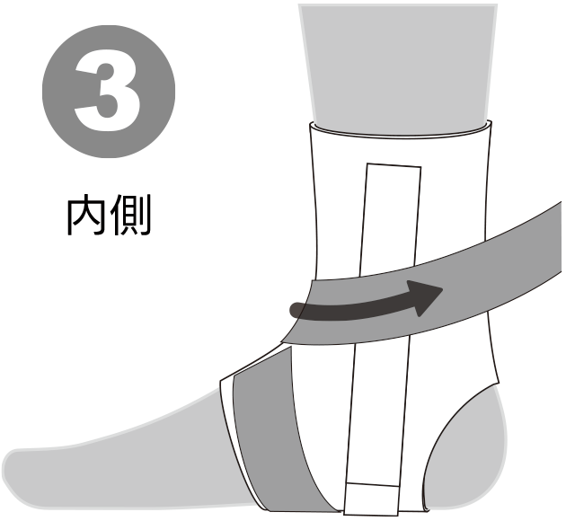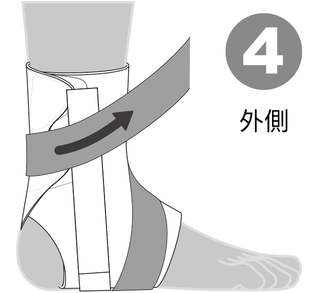 引っ張ってきたテープを足首にらせん状に巻き上げます。※外反制限の場合は、外側から巻き始め、図と逆回りのらせんで巻き上げてください。