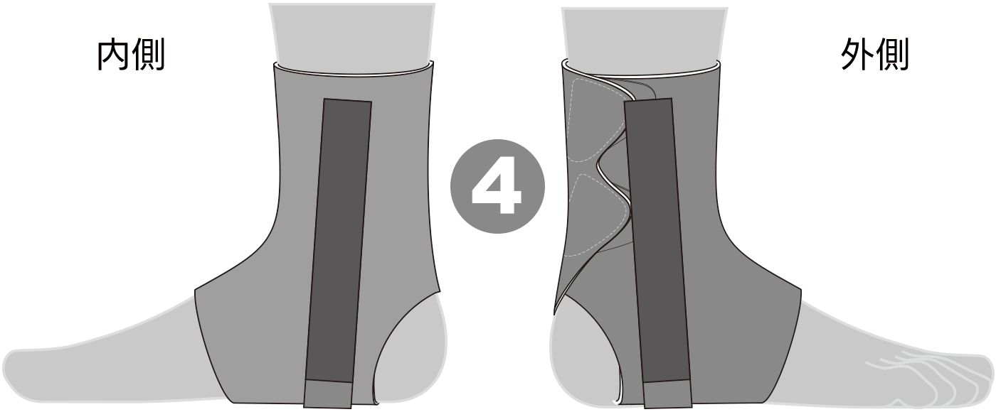 次に外側のテープをとめます。※外反制限の場合は、テープを交差する順番を逆にします。
